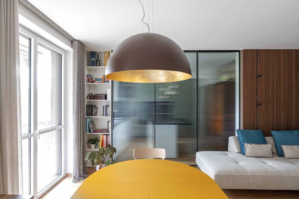 La luce valorizza i rivestimenti selezionati per Casa D e consente alla palette curata di perpetuarsi per tutta l’abitazione sottolineando l’incontro tra lo stile pop e quello minimalista.