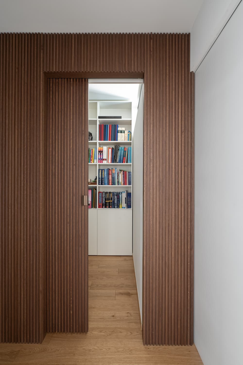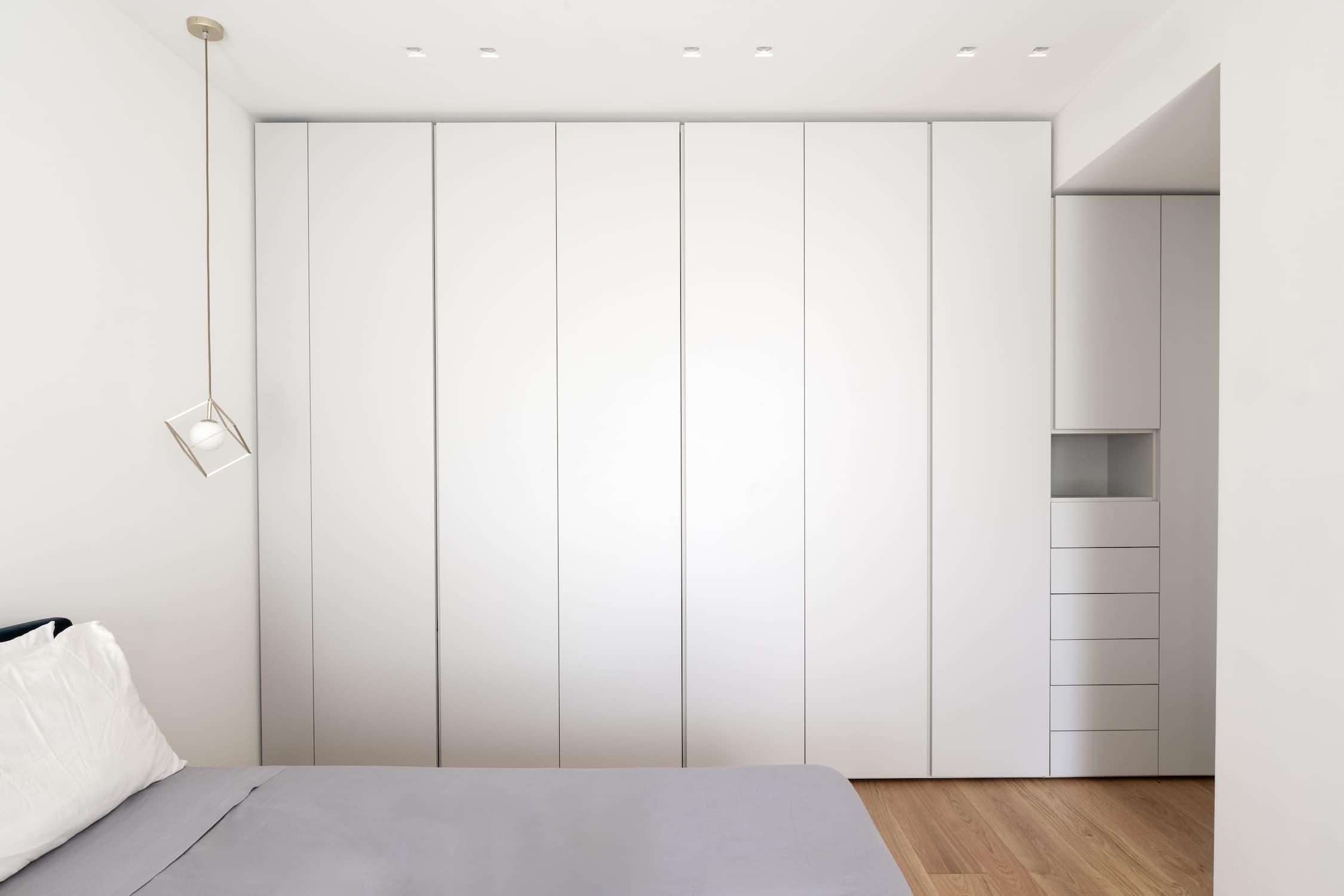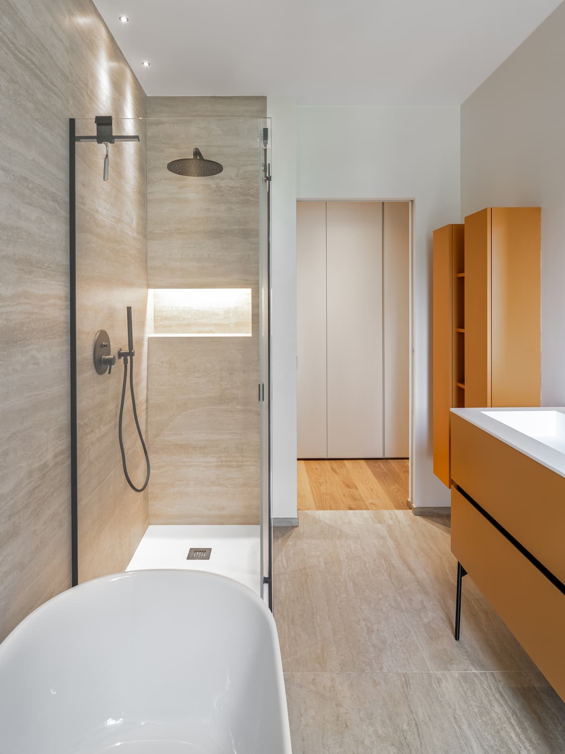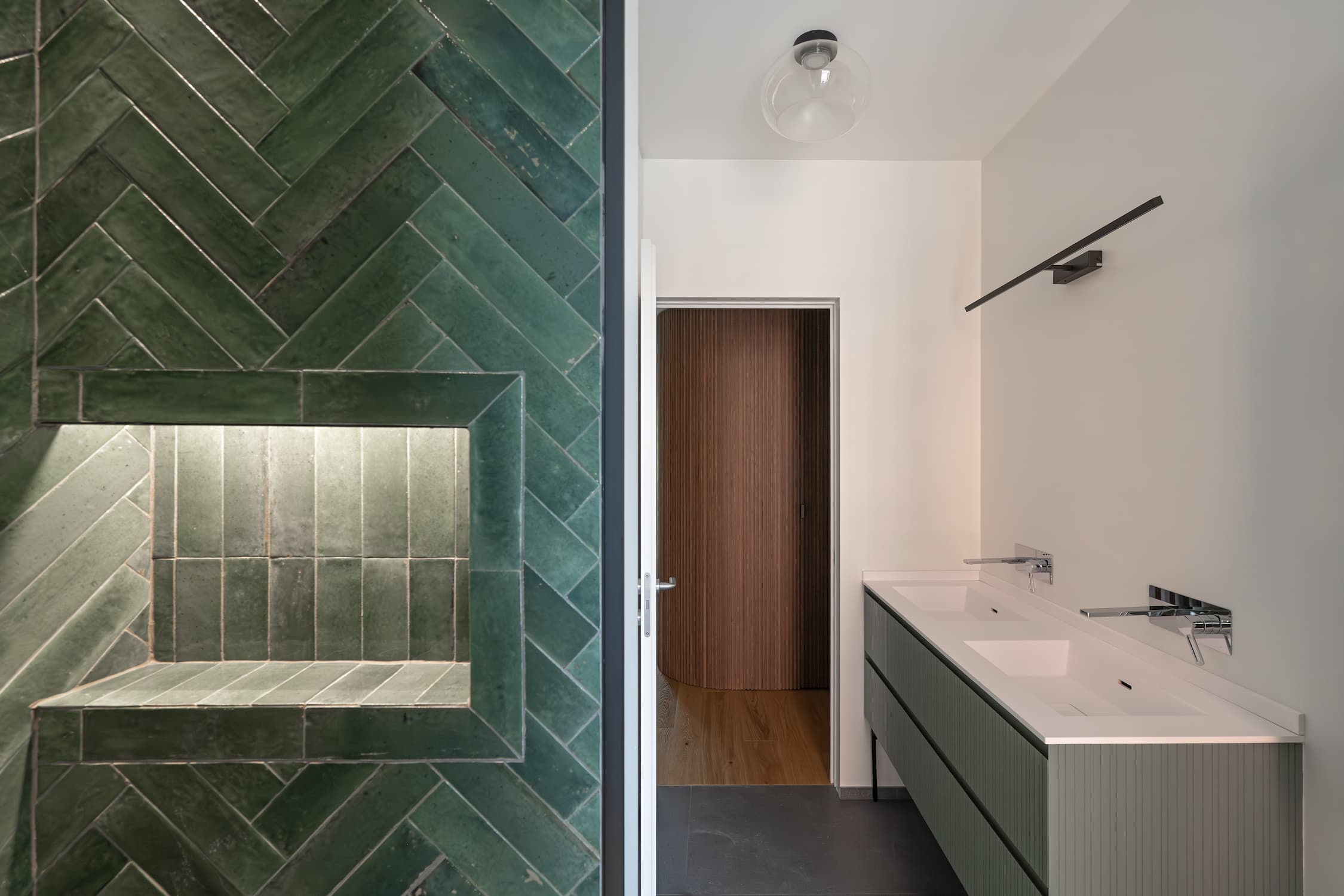 La luce valorizza i rivestimenti selezionati per Casa D e consente alla palette curata di perpetuarsi per tutta l'abitazione sottolineando l’incontro tra lo stile pop e quello minimalista.