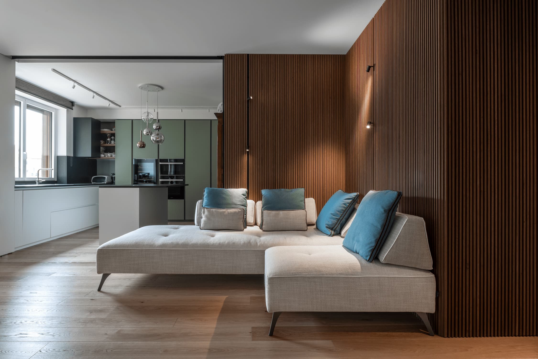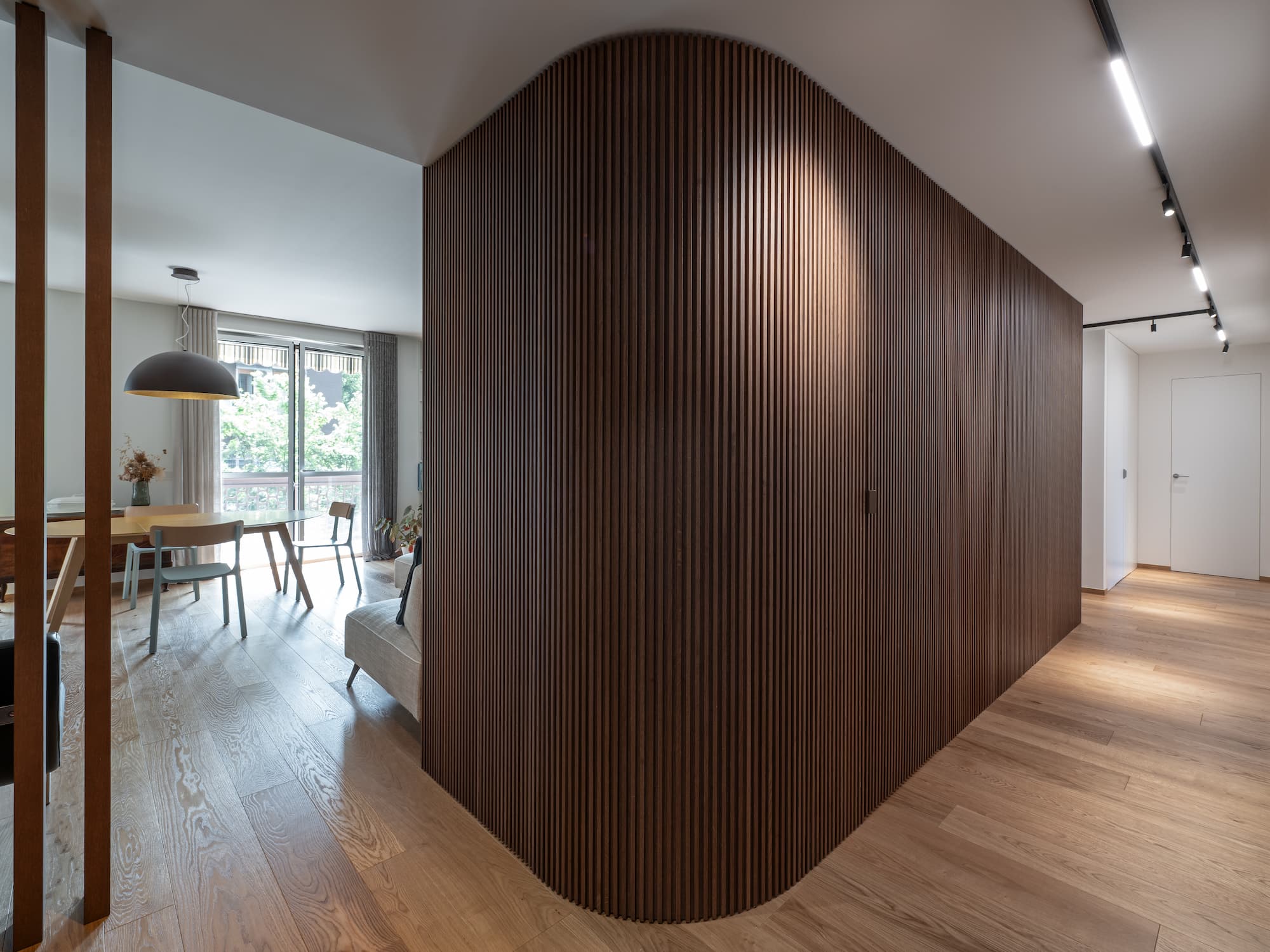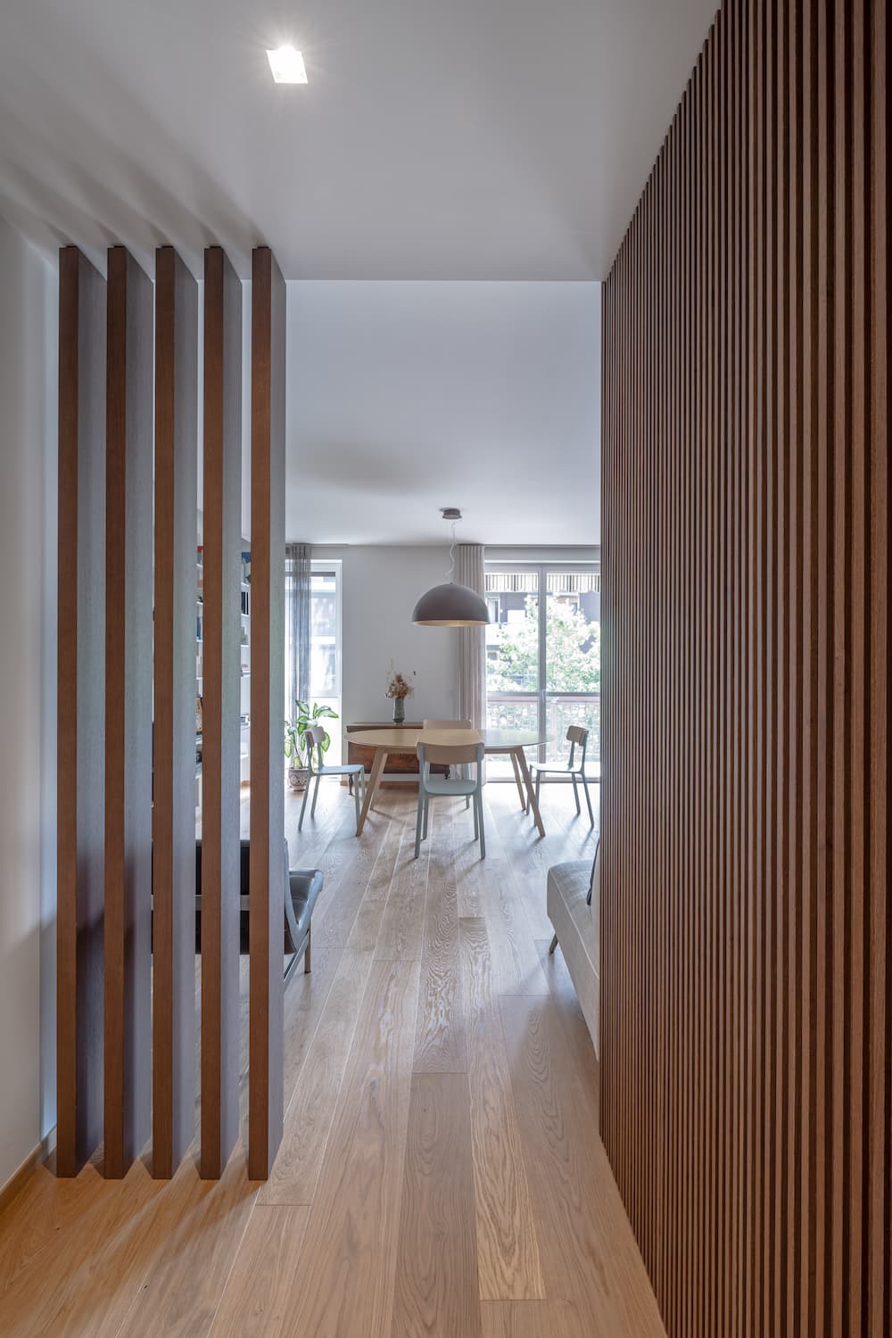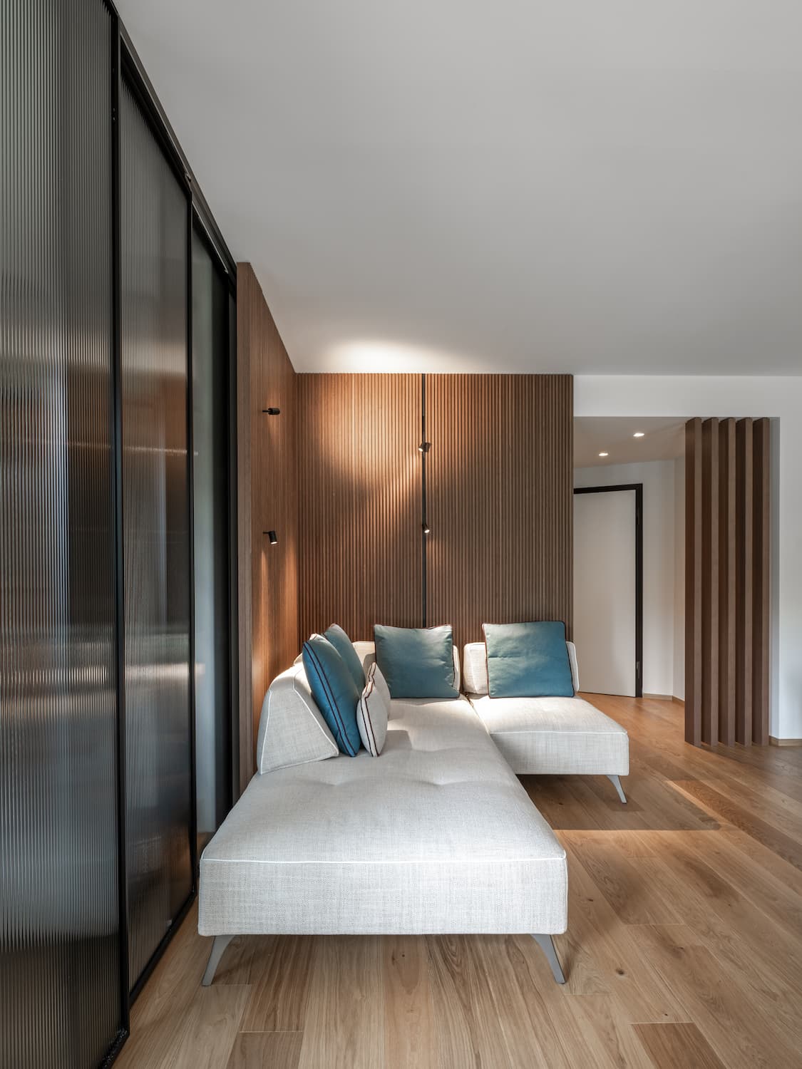 La luce valorizza i rivestimenti selezionati per Casa D e consente alla palette curata di perpetuarsi per tutta l'abitazione sottolineando l’incontro tra lo stile pop e quello minimalista.